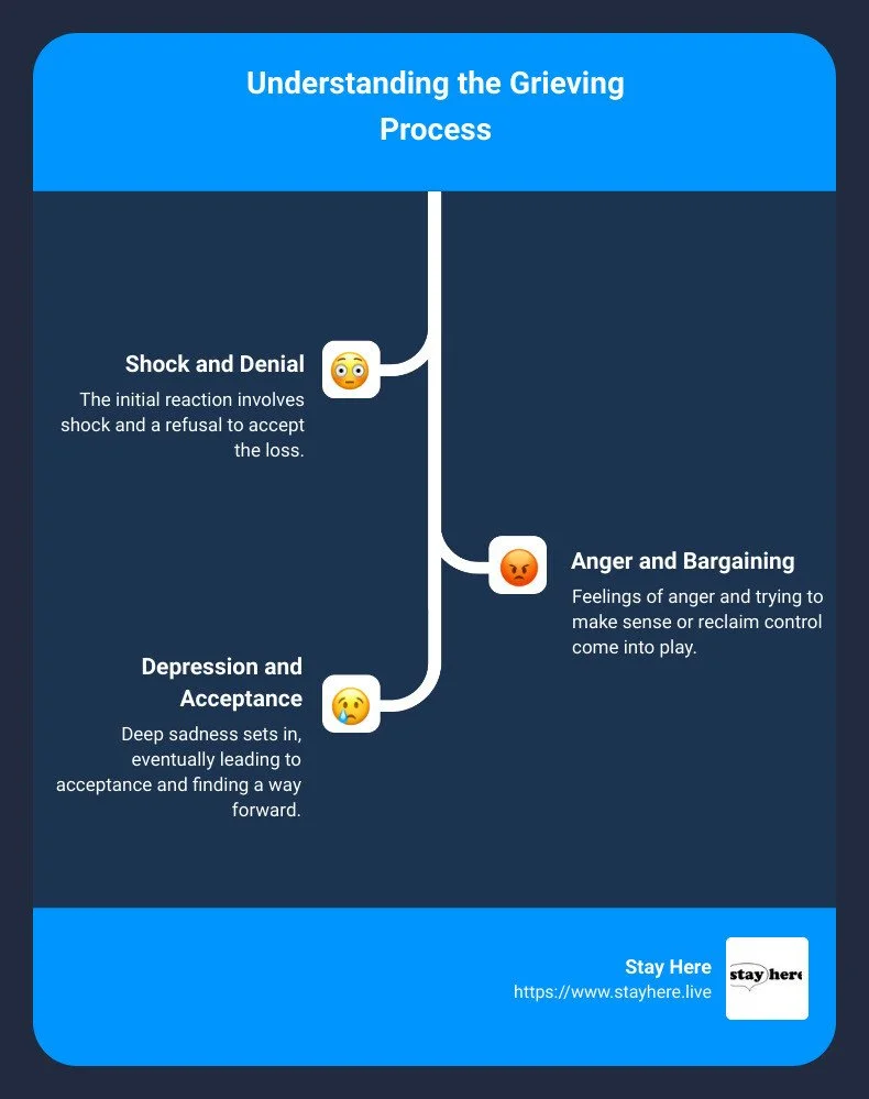 Image Alt Text: Breakdown of Grieving Process - define grieve infographic infographic-line-3-steps