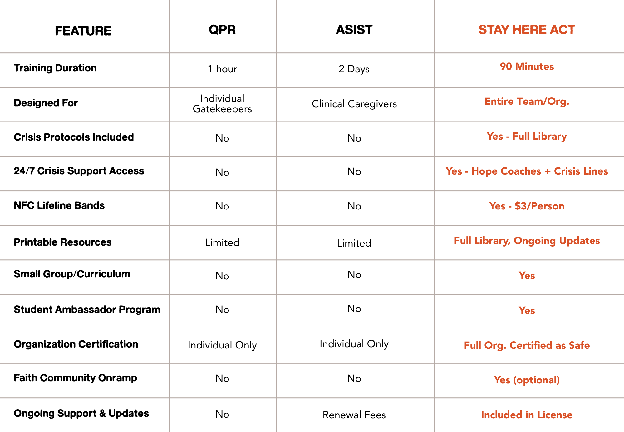 See how the ACT model and Stay Here Safe System compare to other leading programs.